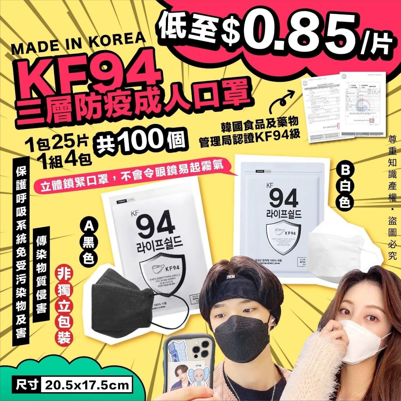 低至$0.85/1片。韓國製KF94防疫成人口罩 (1組100個) (非獨立包裝) (1組4包100個口罩) 一包25片 ,合共100個口罩