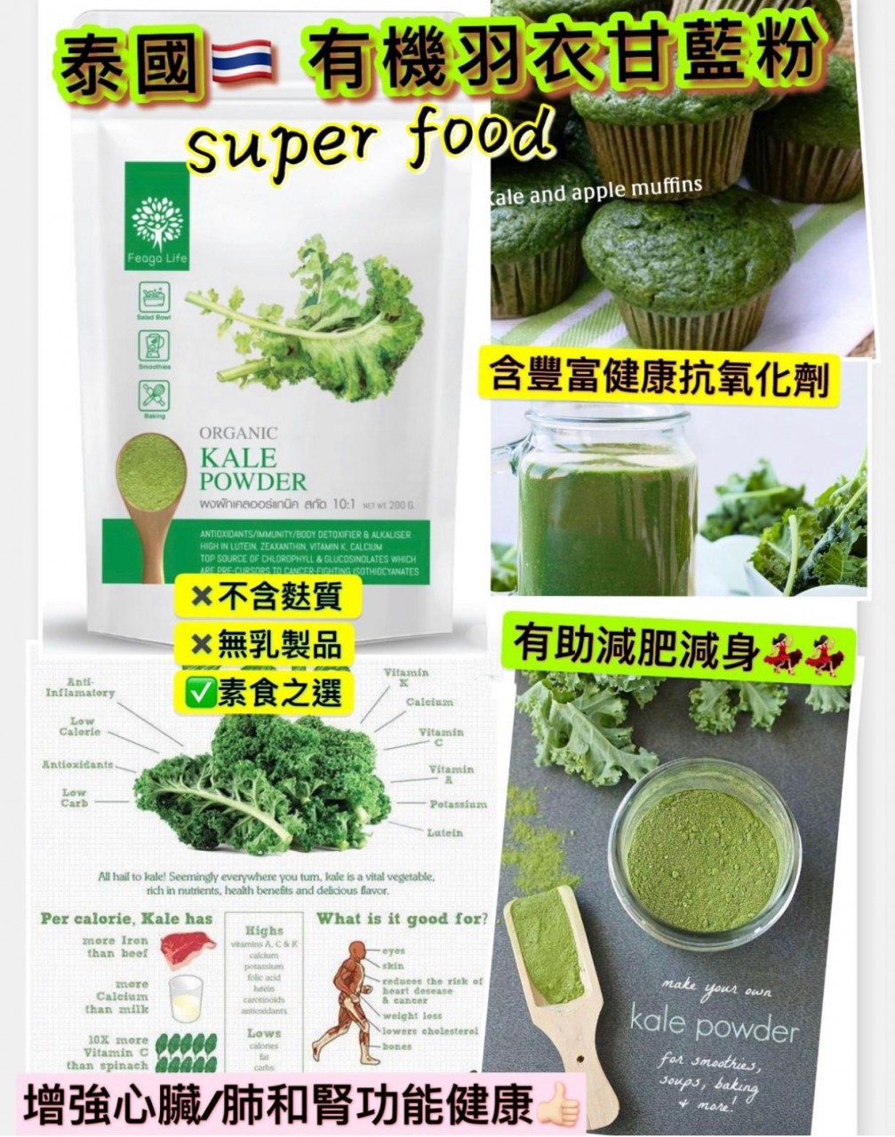 泰國直送有機羽衣甘藍粉 200g🧏🏻♀️近年好流行食#羽衣甘藍 呢種super food 不過香港買1罐180g 都要成$298,而家200g/包價錢勁抵,仲要係有機💁🏻♀️ ▶️10克營養粉 ≈ 100克有機羽衣甘藍▶️富含維生素、礦物質、膳食纖維和抗氧化劑✖️不含麩質,無乳製品,素食之選 ✔️低溫脫水處理全面保留營養✔️全天然,不添加任何添加劑、防腐劑或人工色素✔️從農場24小時內進行低溫處理✔️可加至水,冰沙,果汁,咖啡,湯,烘焙食品或任何您喜歡的食譜中 〰️建議用法〰️將羽衣甘藍粉加入水/牛奶/咖啡/沙律/烘焙食品或任何您喜歡的食譜都可以 📣建議每次食1份約10g 羽衣甘藍的健康益處: 高含量的β-胡蘿蔔素(維生素A),可增強心臟健康,肺和腎臟功能健康 鈣質多,而且含有豐富的維他命K,可加強骨骼健康,預防骨質疏鬆 十字花科蔬菜的一種,維他命C含量高,膠原蛋白增生的天然來源,有效改善皮膚健康、減少細紋色斑熱量低,有助減肥減身 含豐富健康抗氧化劑膳食纖維多,促進腸道蠕動,幫助消化