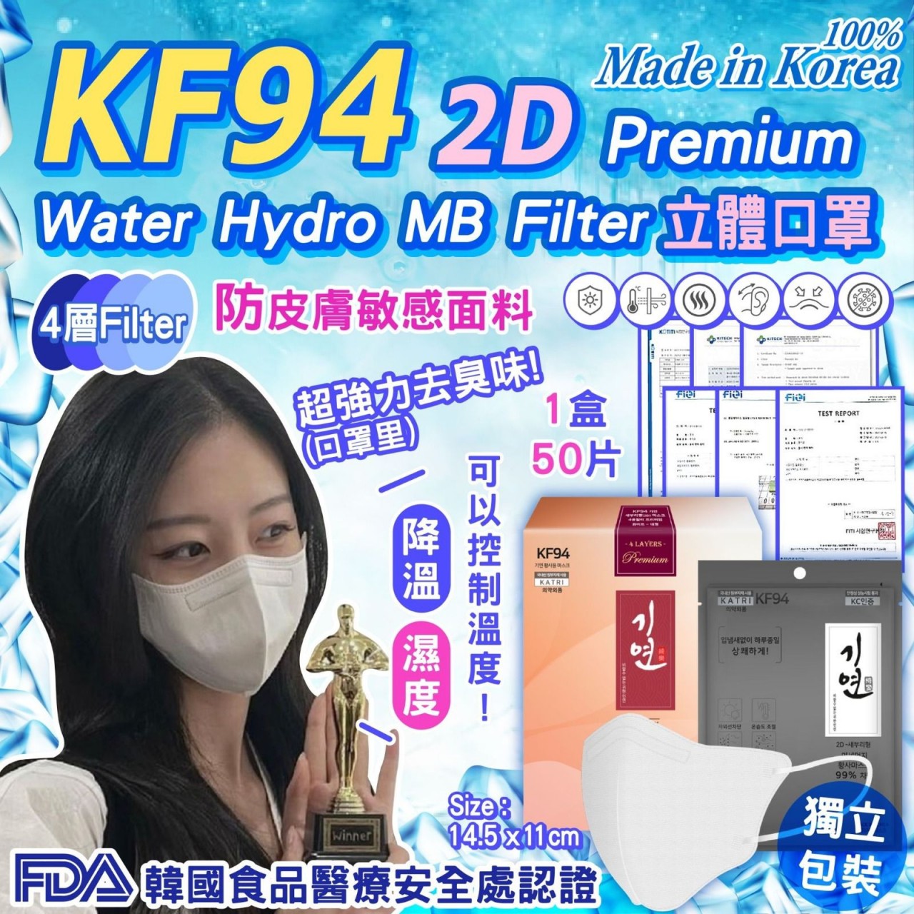 **產品資料:名稱:Water Hydro MB Filter KF94 2D Premium立體口罩