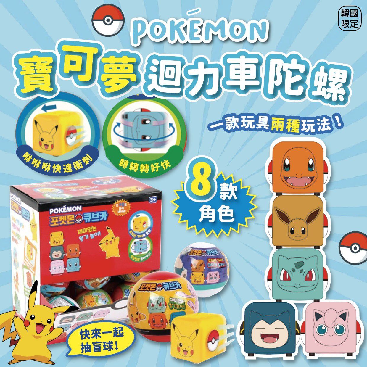 大人小朋友都鍾意既寶可夢抽盲盒玩具黎啦😍共有八款💡可愛既小迴力車🚗轉一下側邊就變成陀螺❗️咁可愛既玩具. 買黎收藏/裝飾/送禮都可👍🏻